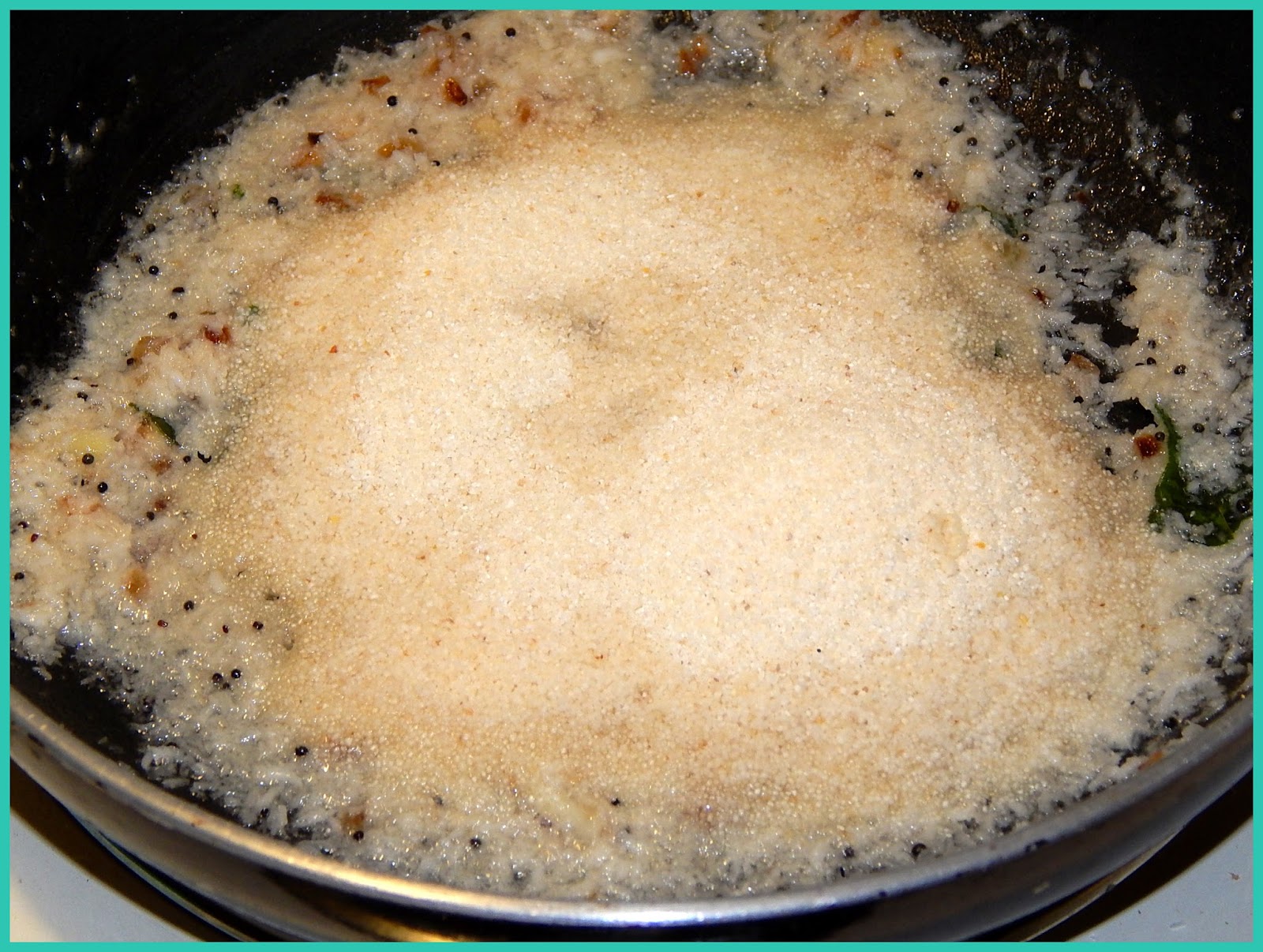 | Add semolina and mix them well. Cover the pan and cook it. |